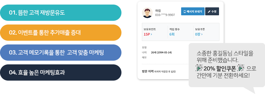 그냥 동네 작은 혼자 하는 미용실이에요. 보통 동네아주머니들이나 단골 분들이 주로 찾으시죠. 그렇다 보니 매번 거의 수입이 비슷해요. 오시는 분들만 오시고 하시는 머리만 하시니까. 그래서 사실 예전에 했던 머리 해달라고 하시면 알고 해드릴 때도 있는데 가끔 오신 분들은 다 기억 못 할 때도 있어서..그런데 이거는 고객들 핸드폰번호만 입력하면 되고 메모에 무슨 머리 했는지 메모해두는 습관을 들였어요. 손님이 오시면 휴대폰번호만치면 바로 보이니까 더 잘 챙겨드릴 수도 있고, 선불권도 시도했는데 반응이 좋더라구요. 때때로 펌이나, 커트 할인문자도 보내니까 소개도 많이 해서 친구분들이랑 같이 오시고 다른 스타일도 많이 하셔서 매출이 느는게 눈에 보이더라구요.