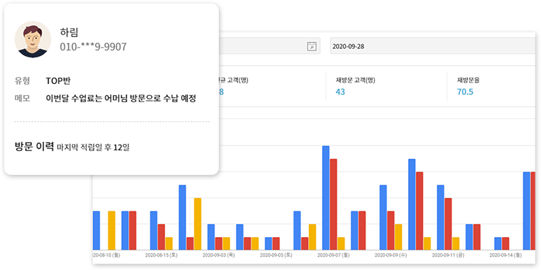 우리 학원/클래스에는 어떤 고객이 많은지, 어느 시간대에 고객이 많은지 등 고객유형을 분석하고 재수강등록, 수납, 수업진도 등 회원들의 특이사항을 회원정보 메모란에 기재하여 효율적으로 관리해보세요.