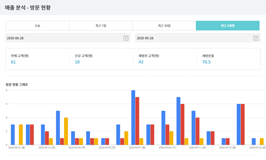 달려라 김과장에서 우리매장 고객님들 방문 요일,유형,성별,나이 등을 파악하여 분석하고 눈에 보이는 금액적인 매출분석까지 가능합니다. 적을 알아야 백전백승! 우리매장을 좀더 자세히 분석하고 매출증대까지 노려보세요.